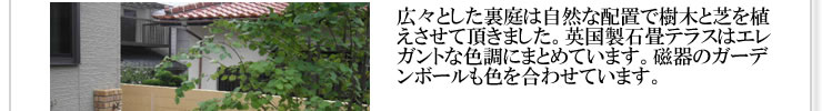 広々とした裏庭は自然な配置で樹木と芝を植えさせて頂きました。英国製石畳テラスはエレガントな色調にまとめています。磁器のガーデンボールも色を合わせています。